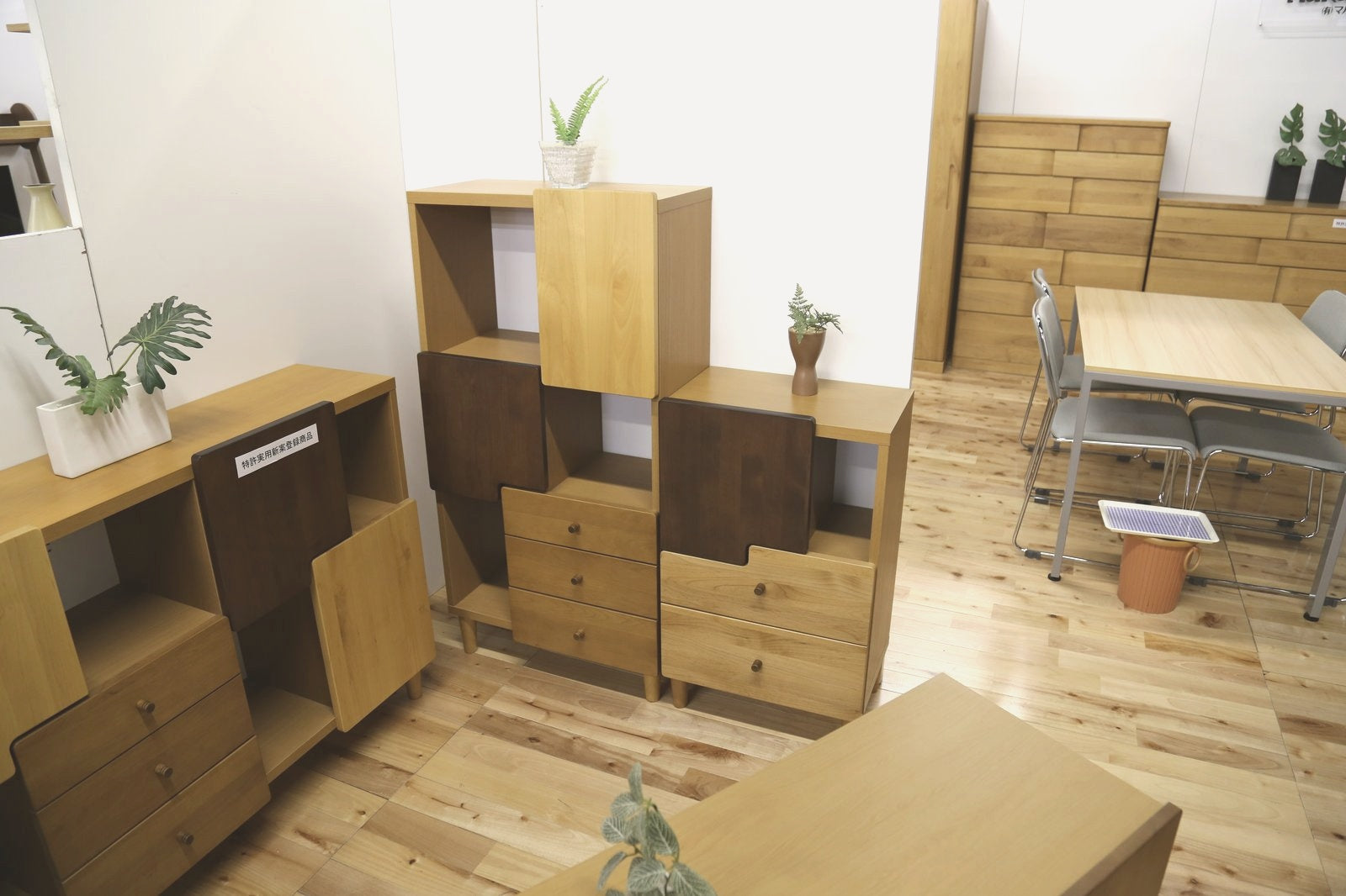 自社工場や提携工場で職人が丹精込めて作り上げた数々の木製家具。