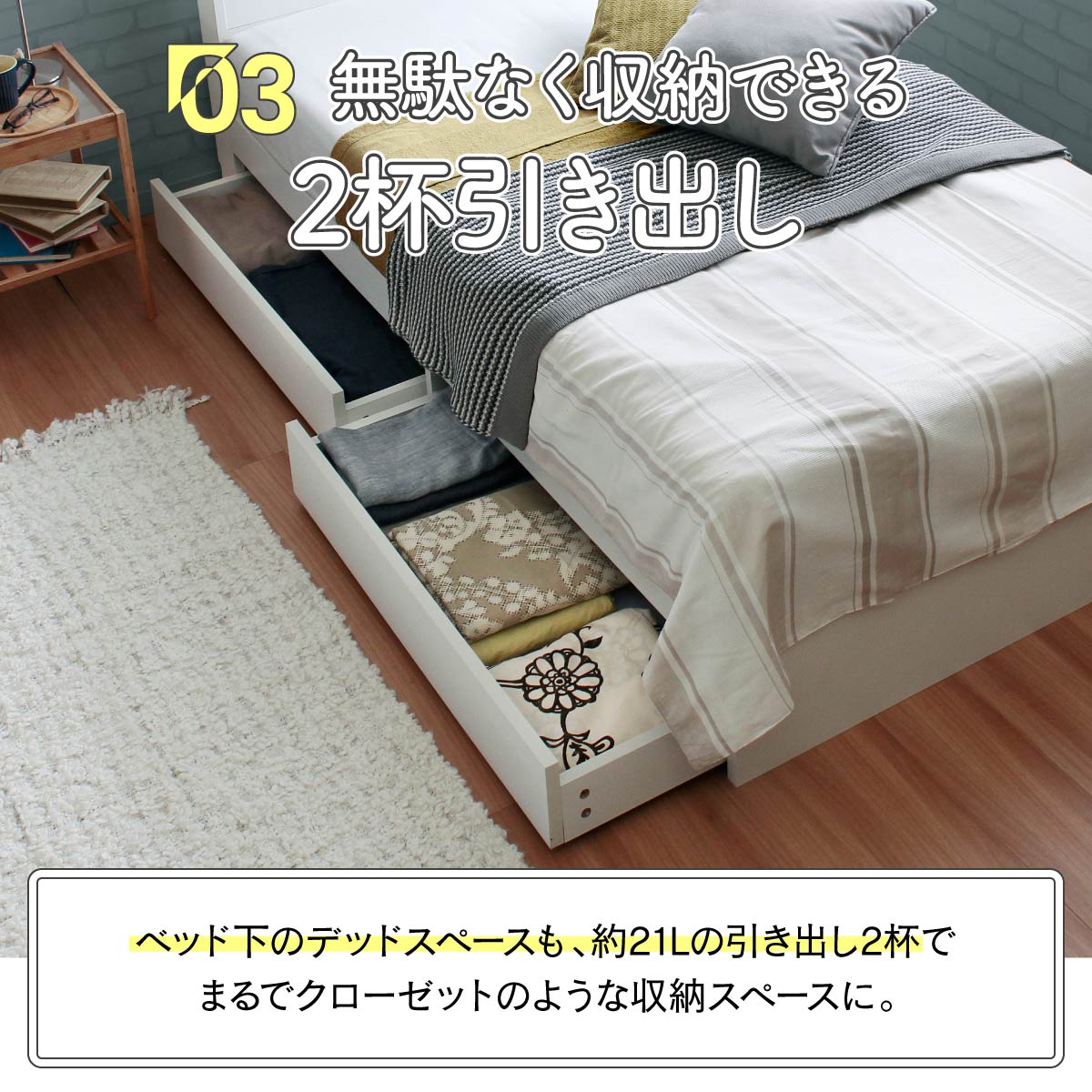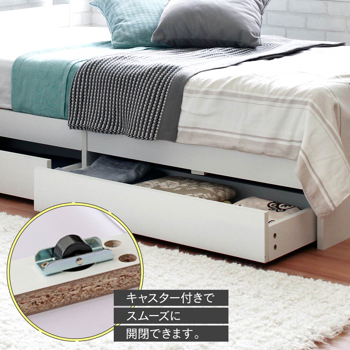 ベッド下には左右どちらにも設置可能なキャスター付き引出しが2つ備わっており、季節外の衣類や寝具などかさばる物をスマートに収納できます。また、壁にぴったり設置できる巾木よけ加工のおかげで、貴重な数センチのスペースも無駄にしません。