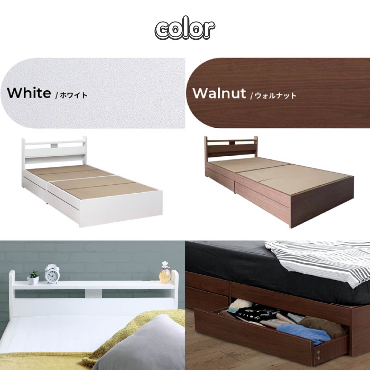 ●狭いお部屋を広々使える隠せる収納付きショート丈ベッドです。 ●ベッド周りで使用頻度の多い電源!ヘッドボード内にお好みの口数の電源タップを収納しておけます。 ●もちろん、使い勝手にもこだわり、6cmのスリットにし、コンセントの抜き差しも簡単に行えます。 ●また、収納棚に照明を置いて、柔和な光がおしゃれな間接照明としてもご使用頂けます。 ●ヘッドボードの足元は巾木よけの加工があり、電源タップのコードが壁に挟まらずに使用出来ます。 ●ベッドの下には二杯のキャスター付きの引出しが付いており、ベッドの左右どちらにも変更可能です。 ●高強度のクロスフレームを採用し、各部材を金具で固定する為、ガタツキにくい作りとなっています。 ●ベッドの表面材は低圧メラミン化粧板を採用し、傷や汚れに強く、水拭きが出来るのでお手入れも簡単です。 ●同シリーズのベッド単体のみでも販売を行っております。 |