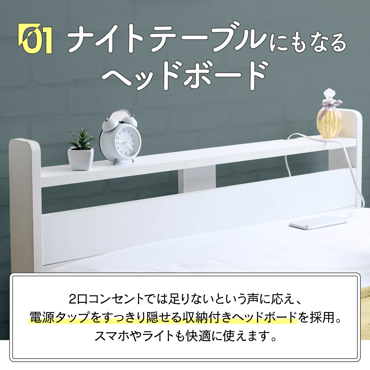 ヘッドボードの内側には電源タップを丸ごと隠せる収納スペースがあり、見せたくない配線類をすっきりと片付けながら、棚の上は便利に使えます。
