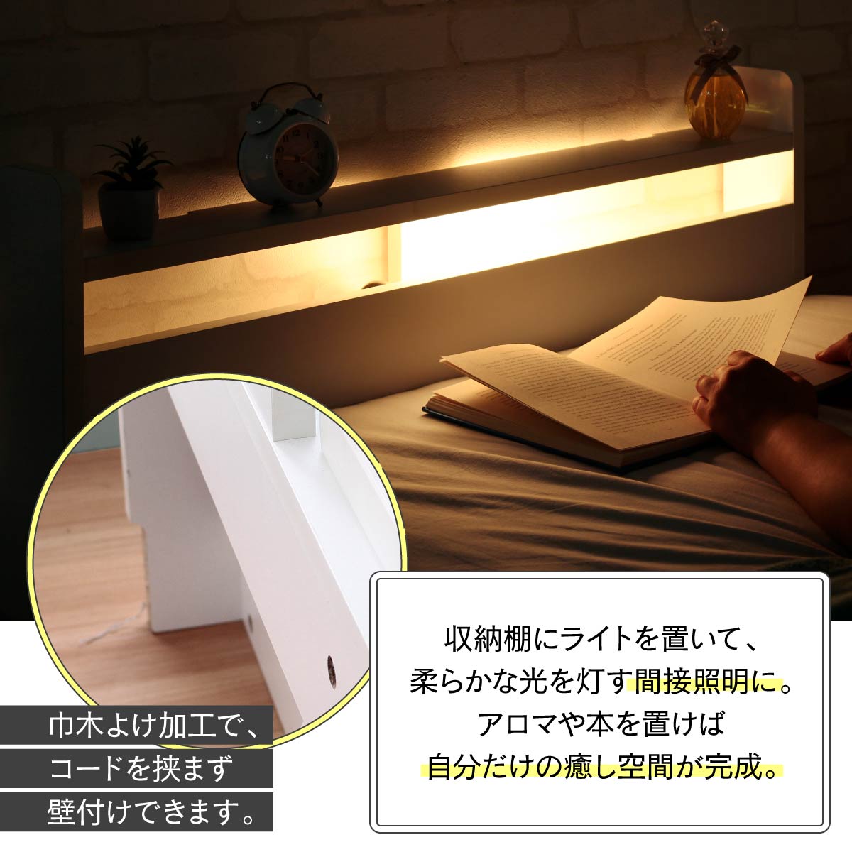 ヘッドボードにお気に入りの照明を置けば、一日の終わりを優しく照らす間接照明になり、巾木よけ加工で壁にぴったり寄せられるから、あなただけの特別なリラックス空間が完成します。