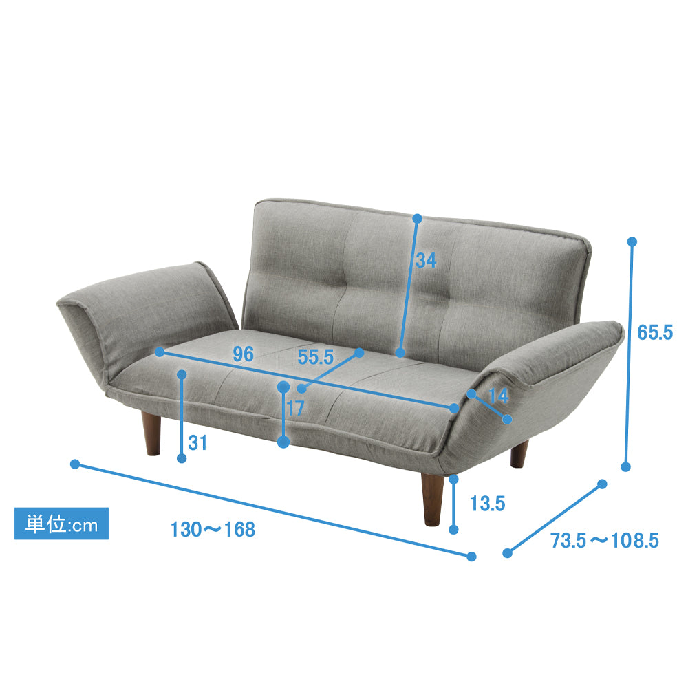 コンパクトながらも座面幅は約W960〜W1680mmまで広がり、奥行きもD555〜1085mmまで変化するため、一人掛けから寝そべれるサイズまで変幻自在。一人暮らしの限られたスペースでも、家族が集うリビングでも、空間を有効活用できる設計になっています。さらに、脚を取り外せばローソファとしても使用可能で、お部屋の雰囲気に合わせた使い方ができます。