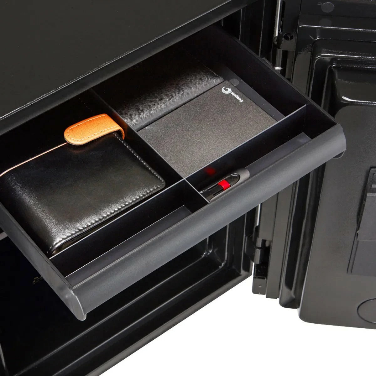 多機能なテンキー式+指紋認証式ロック(※)が標準装備されており、セキュリティ面でも充実した金庫です。