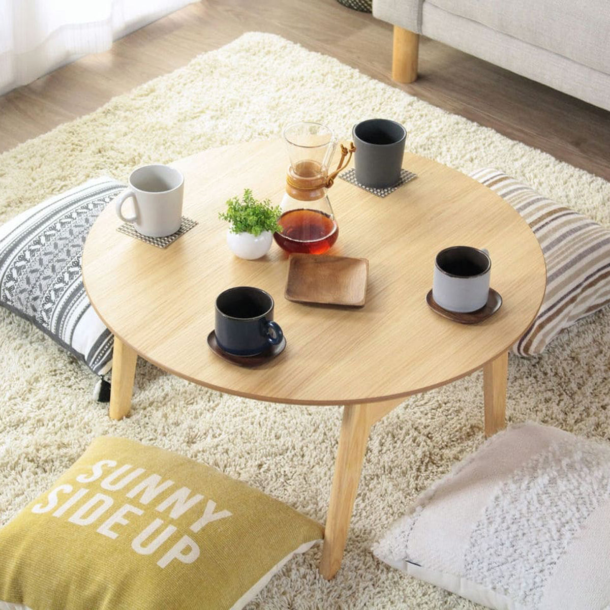 優しい木の風合いが印象的なワントーンカラーの折りたたみ円形テーブル。