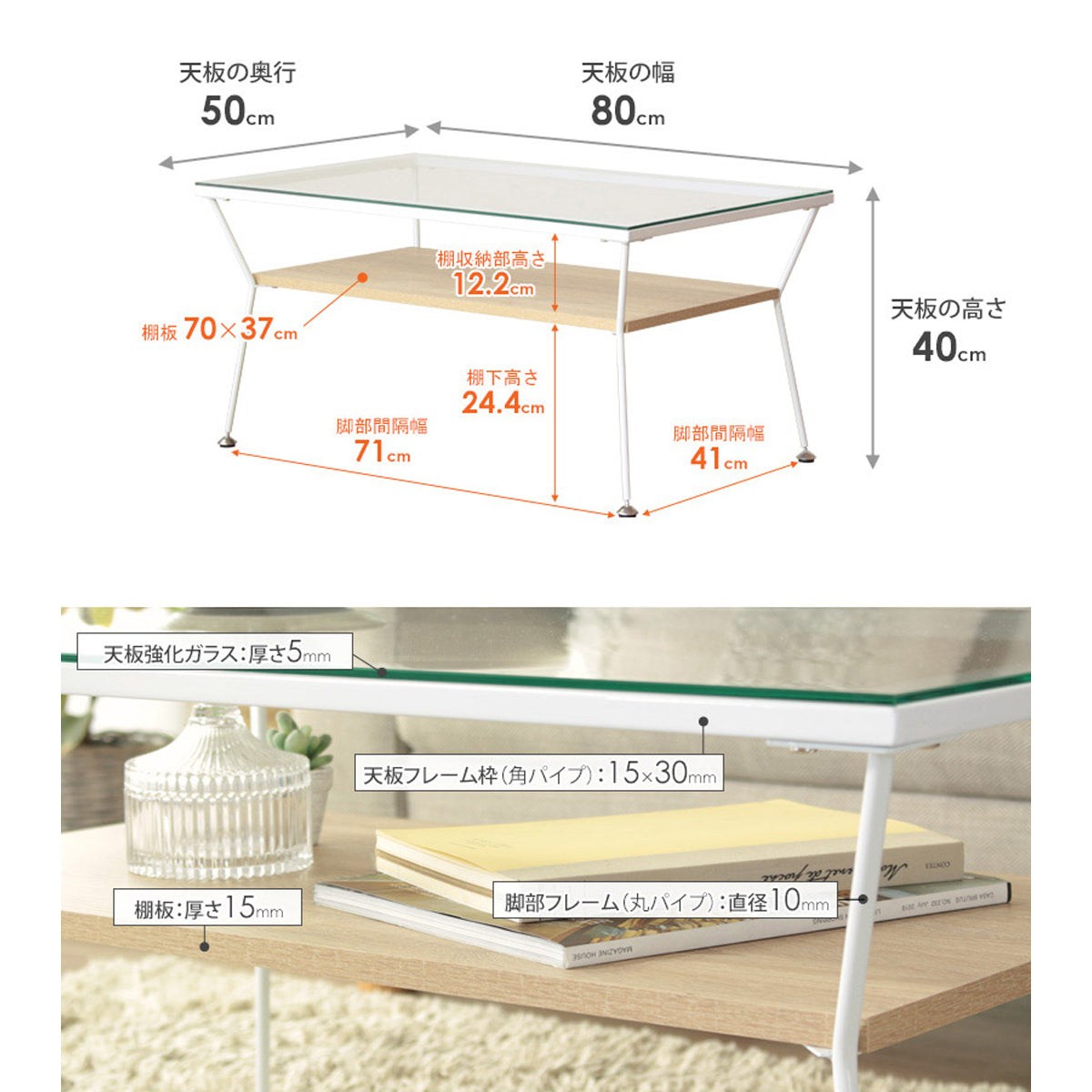 ●お洒落な雰囲気を演出してくれるディスプレイ収納が特徴のガラステーブル。 ●ガラス天板の下に収納スペースを設けることで、飾りながら収納できるリビングテーブルです。 ●細めでスタイリッシュなデザインの4本脚が目を惹き、収納棚やガラス天板を引き立ててくれます。 ●80×50cmの天板サイズは、1人使用にも2~3人掛けソファにも最適で、ホワイト×オークナチュラルとブラック×ウォールナットブラウンの2色からお選びいただけます。 ●お好みのカラーで「魅せる収納」を楽しんで、お部屋を素敵に演出してみてはいかがでしょうか。 |