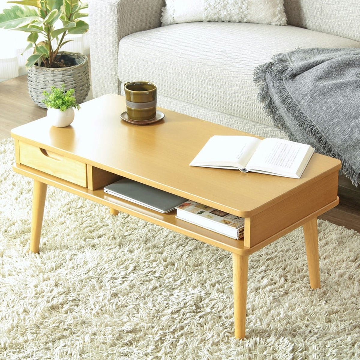 コンパクトながら引き出し収納を兼ね備え、木のぬくもりを感じさせてくれるローテーブル。