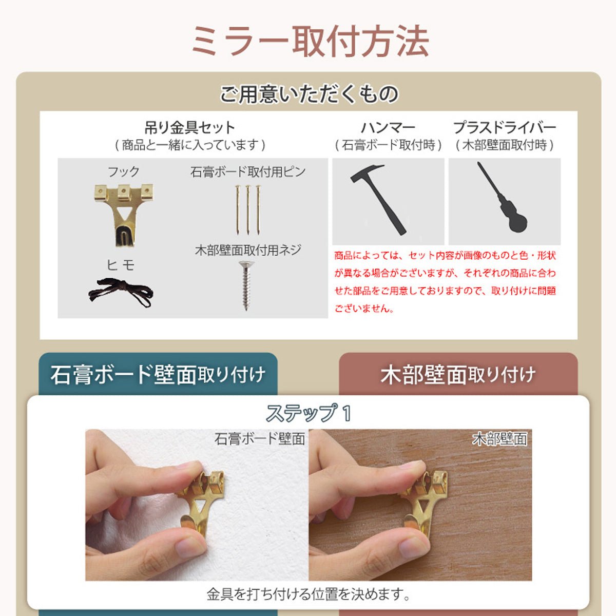 配送料 ◆本州・四国・九州地域に限り、基本送料無料となっております(北海道・沖縄・離島地域は別途見積)。 ◆お届け先が、北海道・沖縄・離島地域となる場合は、各種条件により料金が異なります。 ◆ご注文いただいた内容について、別途、正式な送料を含めた確認メールをお送りさせていただきます。 ◆こちらの商品は、組立設置希望の場合、別途費用が発生します。 商品説明 ●シンプルで場所を選ばず使いやすい、天然木を使用した国産細枠ウォールミラー。 ●天然木のツガ材を使用したフレームは、ミラー面との段差がほぼないフラットなデザインで、見た目も美しく日常に取り入れやすいです。 ●ウォールミラーは、玄関やトイレなどスペースの無い場所に鏡をプラスしたい場合に最適です。 ●鏡を設置すると、空間に奥行が生まれてお部屋が広く感じられ、ミラーが光を反射することでお部屋全体が明るくなるというメリットもあります。 ●塗装には安全性の高いF☆☆☆☆のウレタン樹脂塗料を使用し、鏡には破損時の破片の飛び散りを防止する飛散防止加工を施すなど、安全面にも配慮を欠かしません。 ●玄関や一人暮らしのお部屋に最適なスリムサイズから、全身をくまなくチェックしたい方にぴったりなワイドサイズまで、幅広いサイズをご用意しているので用途やスペースに合わせてお選びください。 ●フレームのカラーは、ホワイト・ナチュラル・ブラウンの3色をご用意しています。 ●壁掛けヒモ付きで、お届け後すぐにお使いいただけます(※壁側の取付け金具(フック)は付属しておりませんのでご注意ください)。 ●安心安全、高品質の国産商品となっています。 商品情報 ■サイズW600×D23×H900mm ■内寸ミラーサイズ:W580×H880mm 枠幅:10mm 厚み:23mm ■商品重量4.5kg ■梱包サイズW620×D990×H50mm ■梱包重量5.5kg ■カラーホワイト、ナチュラル、ブラウン ■付属品壁掛け用ひも ■材質材質:天然木(ツガ材)・ミラー(3mm厚) 塗装:ウレタン塗装 ■機能飛散防止効果あり F☆☆☆☆適合商品 縦・横どちらでも壁掛け可能 ■組立有無無し(完成品) ■配送エレベーターなしの場合、別途階段上げ料が発生します。また、配送の時間指定は出来ません。ご了承ください。 メーカー在庫品の為、取寄元の在庫が品切れの場合は、注文をキャンセルさせていただきます。 ■注意事項この商品は大川民芸家具ではございません。予めご了承ください。 ■備考受注生産商品の為、納期についてはご注文後約2週間程お時間をいただきます。 天然木の性質上、木目の柄や節、色味などに個体差がございます。