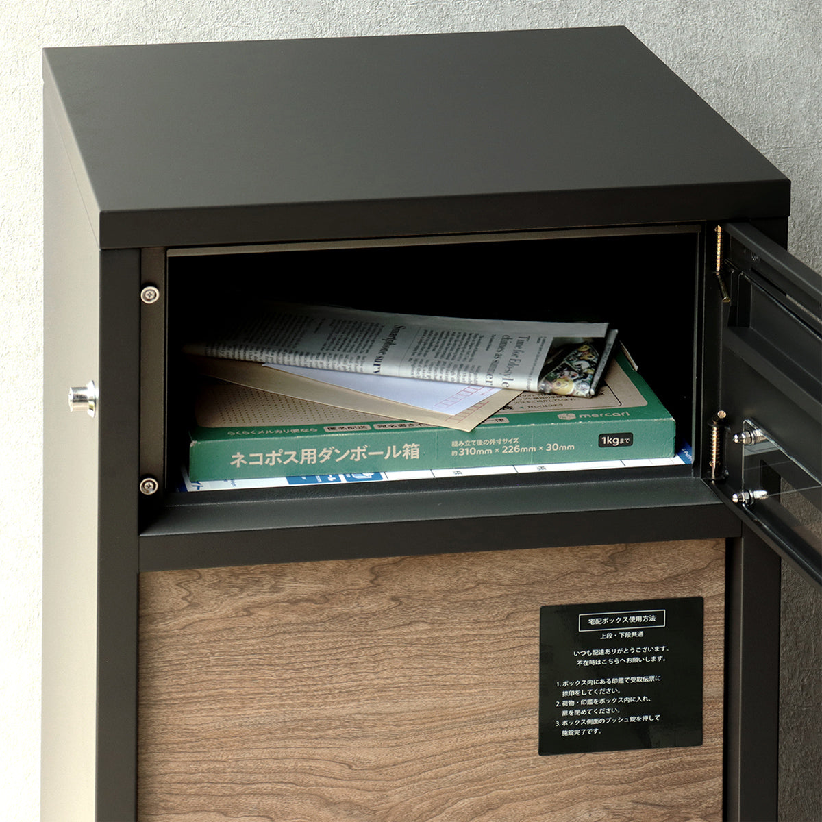 下段の宅配ボックスの収納部は、幅32.8cm×奥行31.6cm×高さ44.7cmと大容量で、大きな荷物も余裕で入ります。