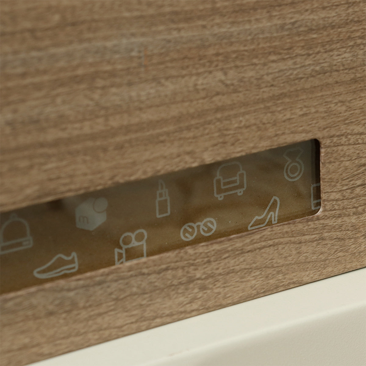 落ち着いたモノトーンカラーに、下段扉の木目がデザインのアクセントとなり、玄関に置いてあるだけでおしゃれな1台です。