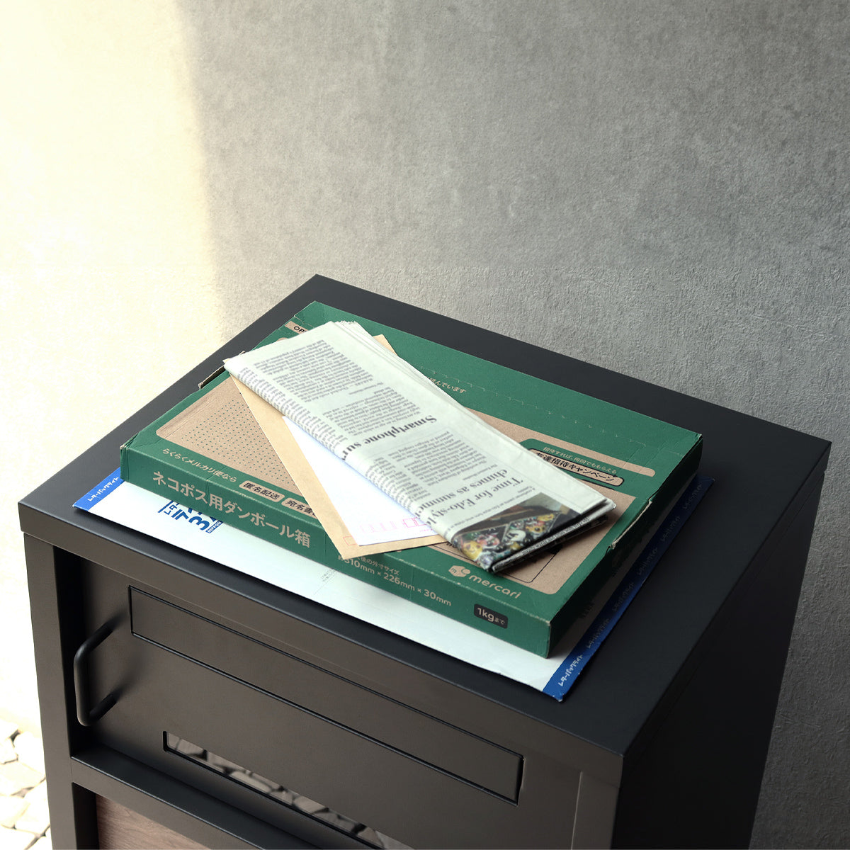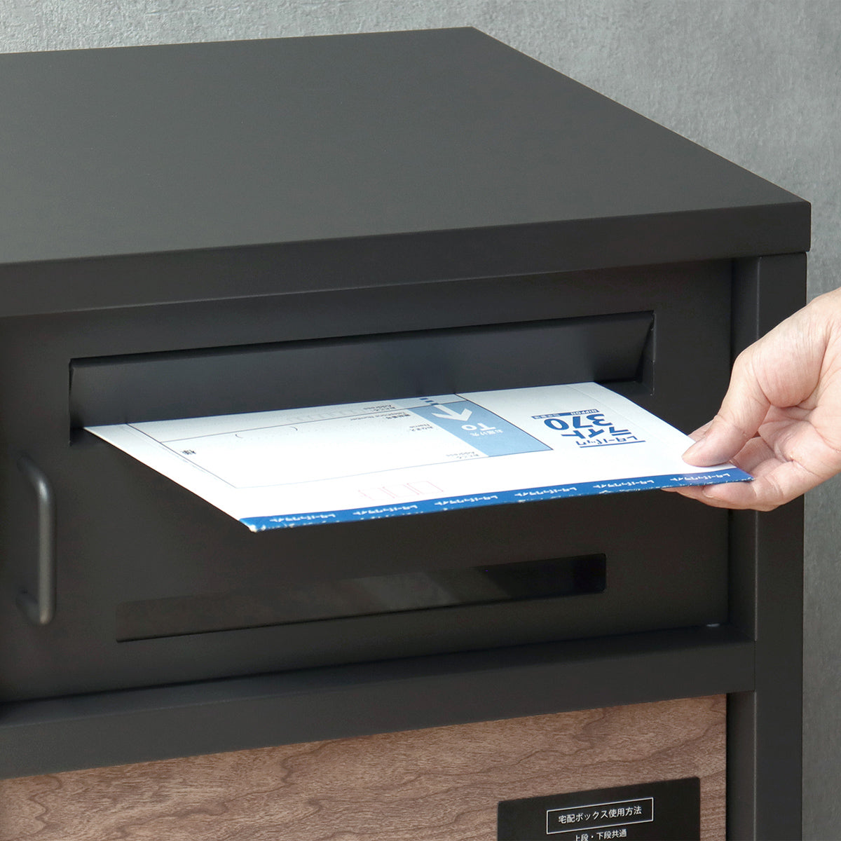 上下2段構造の優れた機能性が魅力で、上段は通常の郵便物だけでなく、ネットショッピングでよく使われるゆうパケットやネコポスにも対応する大きな投函口を備えています。下段の大容量スペースには、shoes boxサイズの荷物も余裕で収納可能。一日に複数の配達があっても柔軟に対応できるため、再配達の手間から解放されます。
